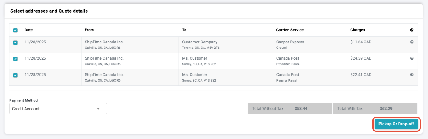 Quotes for each address will display. Once confirmed, select Pick-up or Drop-off.