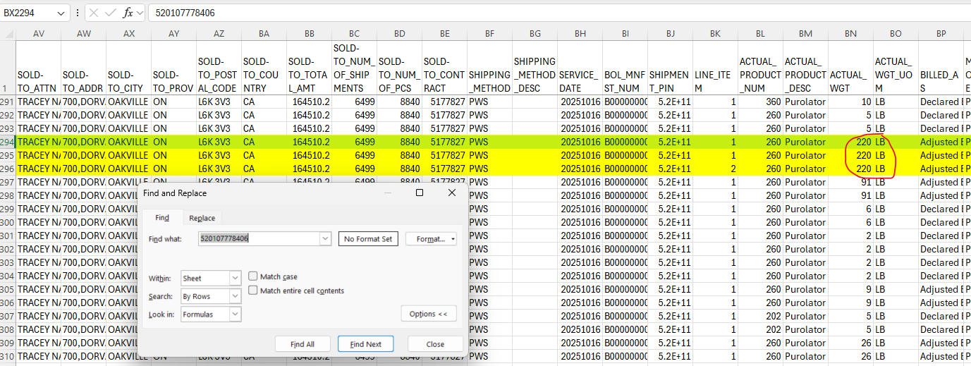 - Go to Column BN → Actual_WGT >All the associated numbers of that shipment will be generated, highlight the lines to make it easy to find.