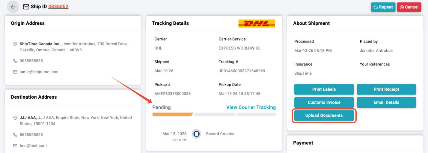 You will see the Upload Documents option if the courier allows for additional documents to be added. This feature enables you to manage shipment documentation directly within your shipment history and tracking view.