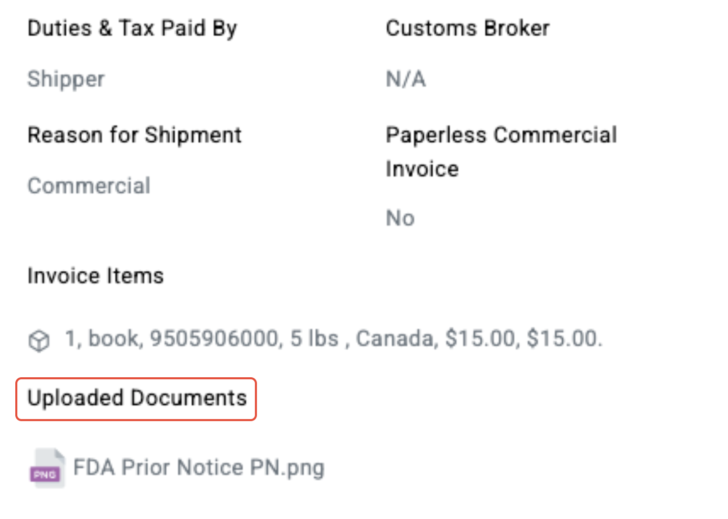 Once a shipment is created and before pick-up/drop-off, users also have the option to add additional documents, such as FDA Prior Notice documentation, which can only be attached once a shipment tracking number is available. This ensures that required compliance documents are linked directly to the shipment record for couriers and customs authorities.