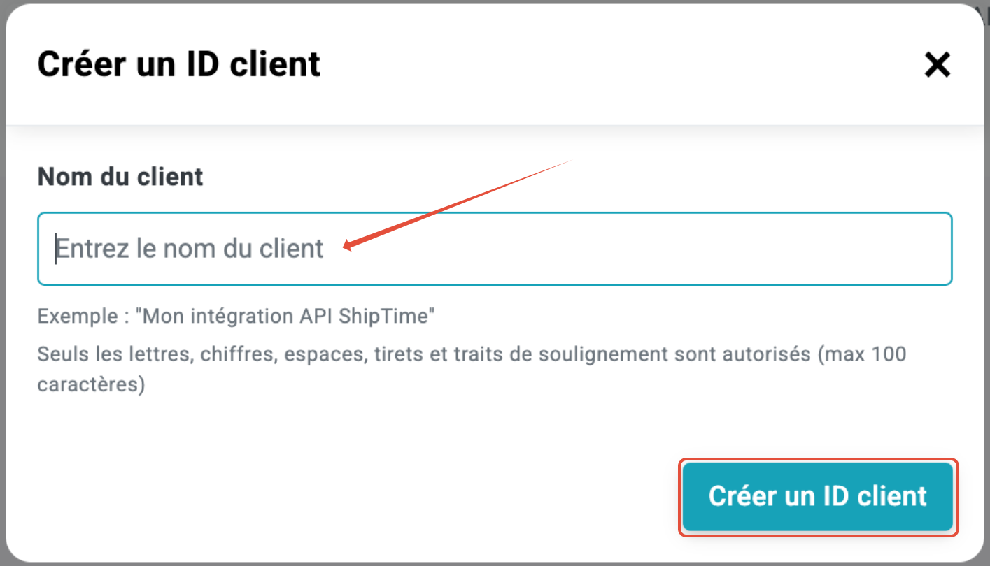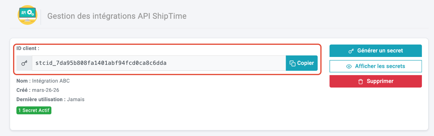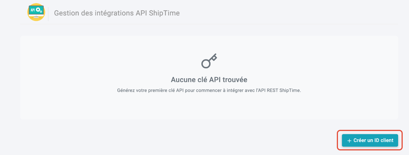 - L'écran Gestion des intégrations API s'affiche. Cliquez sur Créer un ID client