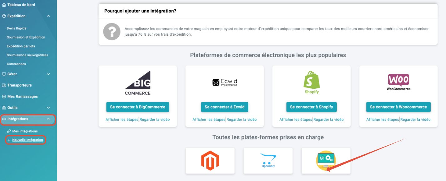 - Accéder aux options d'intégration dans l'interface utilisateur ShipTime