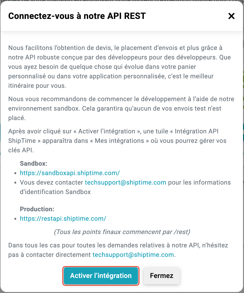 - Contactez techsupport@shiptime.com pour demander des identifiants pour l'environnement de développement (Sandbox).