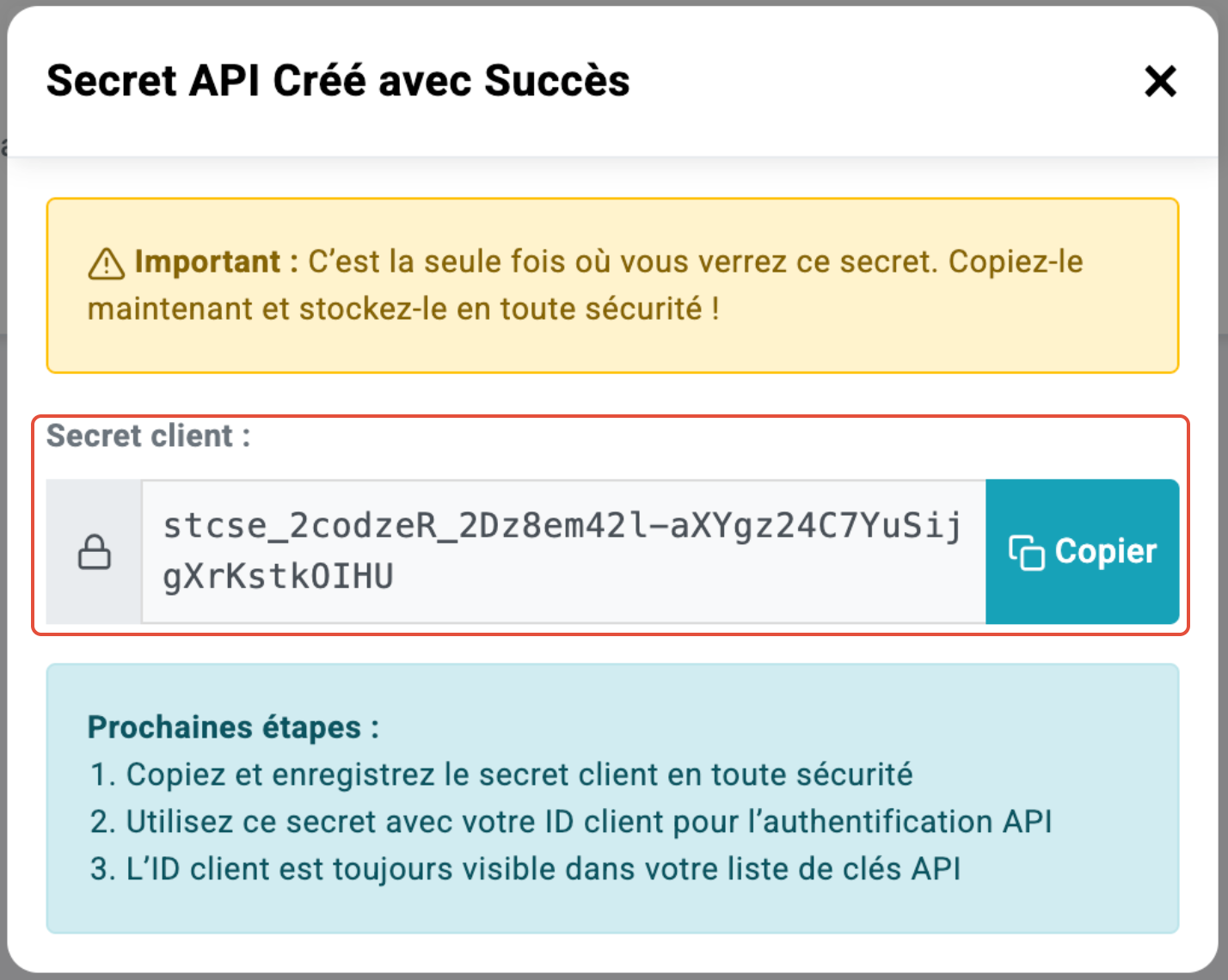 - Votre clé secrète API et votre ID client sont désormais créés. Remarque : la clé secrète API ne s'affichera qu'une seule fois - copiez-la et conservez-la. Une fois la fenêtre fermée, vous verrez l'ID client
