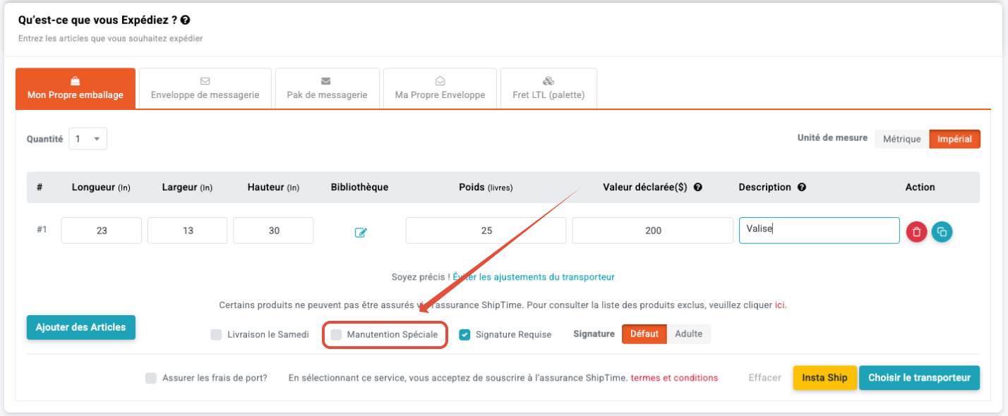 - Si vous ne pouvez pas emballer la valise dans une boîte, veillez à sélectionner l'option « Manutention spéciale » lorsque vous créez votre étiquette d'expédition. Cela permet d'informer le transporteur qu'il doit apporter un soin particulier à votre article.