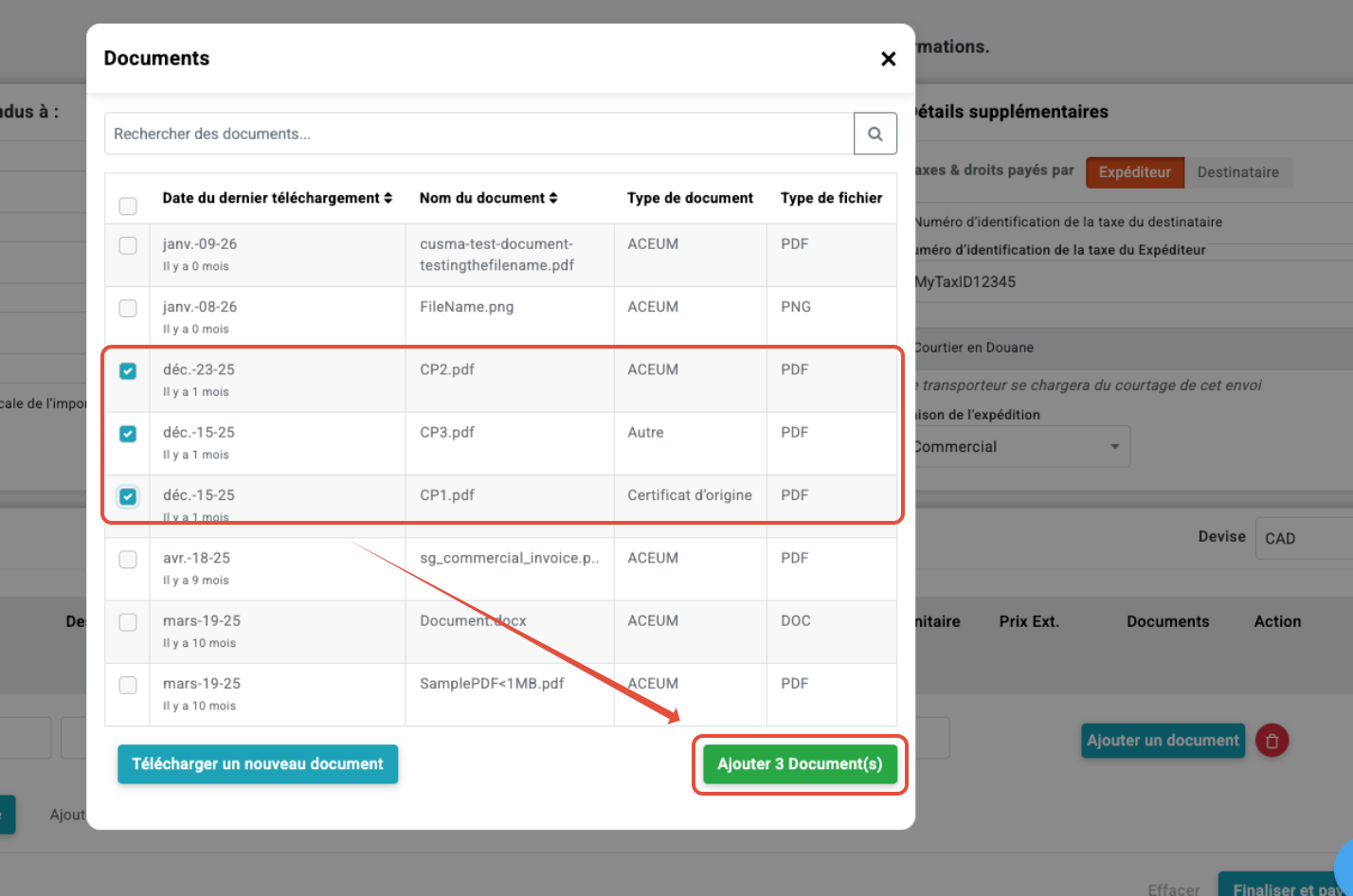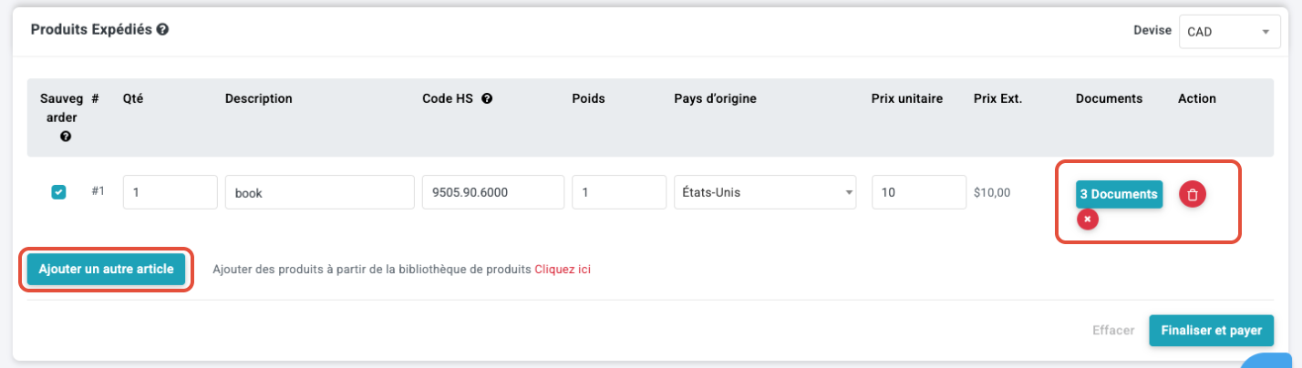 Confirmez que tous les documents requis sont bien associés à chaque ligne de produit. Ajoutez d’autres produits et documents au besoin afin de refléter correctement le contenu de l’envoi.