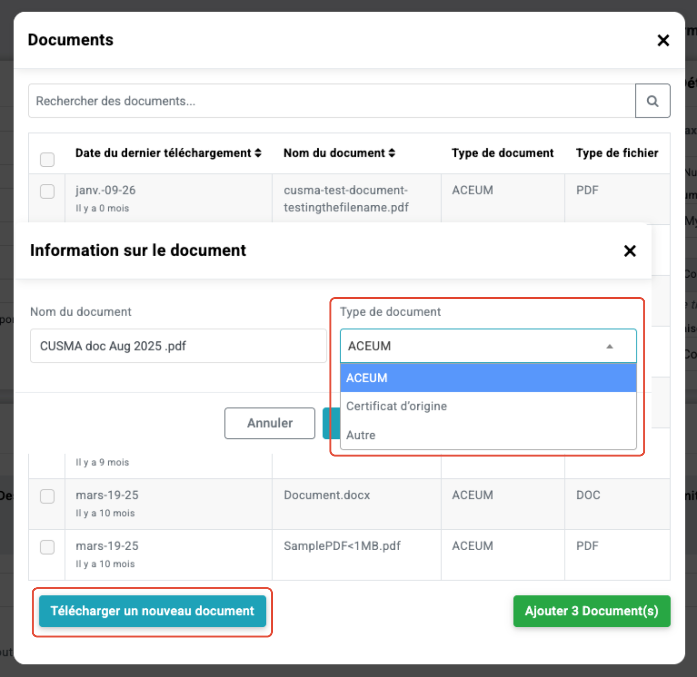 Lors du téléversement, assurez-vous de sélectionner le bon type de document, par exemple :