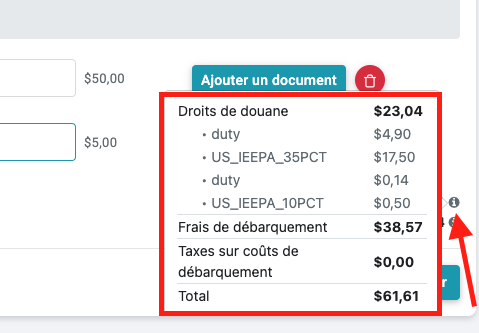 - Pour voir le détail des droits, taxes et frais, cliquez sur le « i » à côté du total.