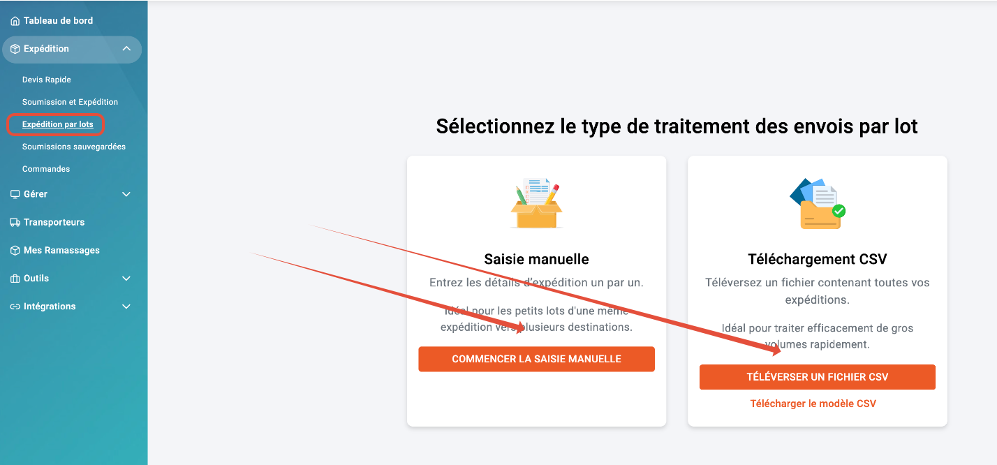 Dans votre tableau de bord, sélectionnez Expédition groupée, puis choisissez la méthode que vous souhaitez utiliser.