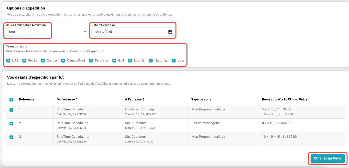 Sélectionnez vos préférences, telles que la date d'expédition ou les options de transporteur, puis cliquez sur Obtenir un devis.