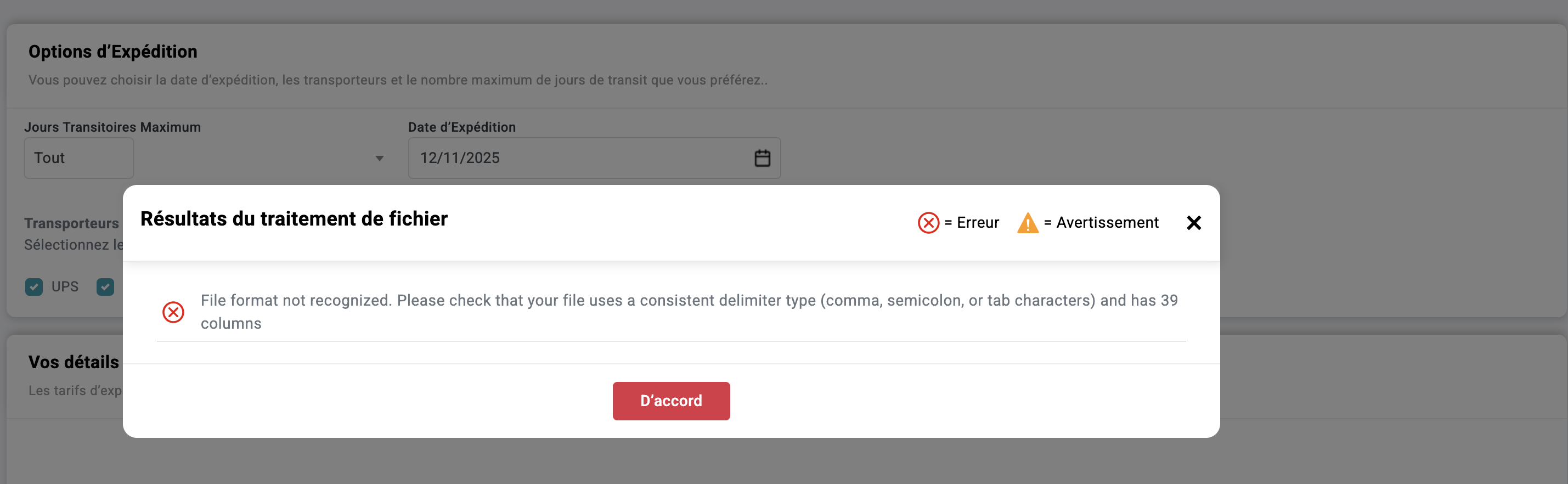 Votre compte doit être activé pour utiliser le téléchargement CSV. Pour plus de détails, contactez support@shiptime.com ou votre gestionnaire de compte ShipTime.