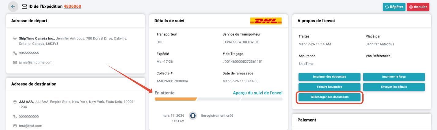 Lorsque vous gérez des envois internationaux, la documentation joue un rôle essentiel pour assurer un dédouanement efficace et un traitement fluide aux frontières. La plateforme ShipTime permet aux utilisateurs de téléverser et joindre des documents à des envois internationaux existants, aidant les entreprises à respecter les exigences douanières tout en améliorant la visibilité de leurs expéditions.