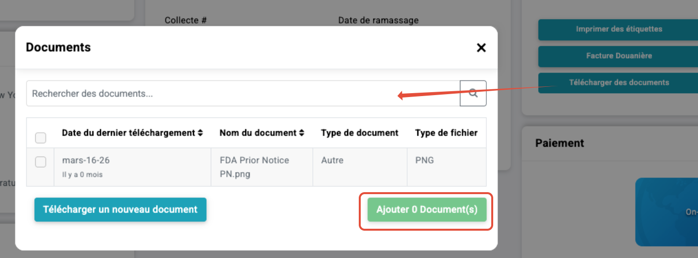 Une fois l’envoi créé et avant la collecte ou le dépôt, les utilisateurs ont également la possibilité d’ajouter des documents supplémentaires, comme la documentation FDA Prior Notice, qui ne peut être jointe qu’une fois qu’un numéro de suivi est disponible. Cela garantit que les documents de conformité requis sont directement liés à l’enregistrement de l’envoi pour les transporteurs et les autorités douanières.