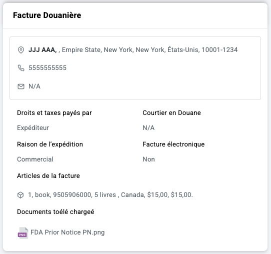 Non. Une fois que le transporteur a mis à jour le suivi, il n’est plus possible d’ajouter des documents et l’option ne sera plus affichée. Pour de meilleurs résultats, assurez-vous que toute la documentation douanière requise est téléversée avant de remettre l’envoi au transporteur.